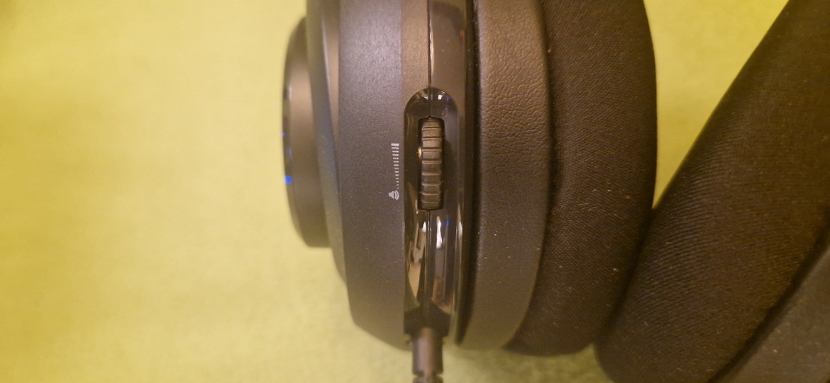 Utöver detta har vi den nedfällbara mikrofonen som sitter på den vänstra öronkåpan, på baksidan av den finner vi volymkontrollen via dess scrollhjul. Detta är allt vi behöver komma ihåg – inga knappar för andra funktioner, vilket jag finner skönt att inte behöva komma ihåg vilken knapp som gör vad. Jag byter dock friskt mellan olika gaming headset beroende på vilken plattform jag spelar på (väldigt mycket ett ”jag”-problem).