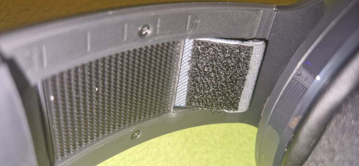 Huvudbandet är inte en traditionell variant med ett helgjutet plastband och en undersida av minnesskum som går över hjässan . Här får vi ett ”flytande” huvudband som ligger innanför en tyg-mesh som håller det på plats (se bild). Du kan dra åt det och få lite mer avstånd från huvudbandet, där du fäster det med kardborrband. Jag personligen hade föredragit ett mer vanligt pannband, då jag tycker det blivit lite väl mycket pillande med att få båda sidorna att sitta rätt på rätt längd. Det blir att den ena sidan inte är mer neddragen än den andra – när väl jag fick det att vara som jag tyckte var bäst rörde jag det ej mer.