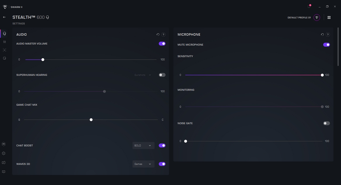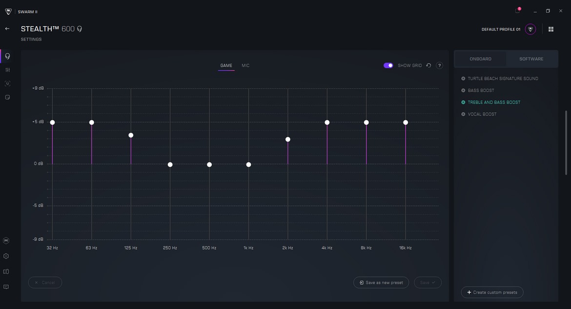 Kikar vi vidare på deras Turtle Beach Swarm app så finns det lite godsaker vi kan kika på. Vi har de vanliga ljudvolym/chattmix, men även deras patenterade ’’Superhuman Hearing’’ som i teori ska filtrera ljudet på ett sätt som gör att mer distinkta läten förmedlas tydligare, så som fotsteg och vapeneld. Jag har testat dessa, men kan inte erkänna att de gör någon avgörande skillnad för mitt spelande. Jag kan tänka mig att dessa funktioner gör sig mycket mer avgörande i lägen där du har mycket pågående under många tillfällen – som i matcher av Counter-Strike 2 eller Valorant. För PUBG – inte särskilt. Om jag ska beskriva ljudprofilen som dessa funktioner erbjuder så kan jag uttrycka det som att basen dras ned markant och diskanten blir mer nyanserad. Fotsteg blir mer distinkta, men i min åsikt, inte avgörande.