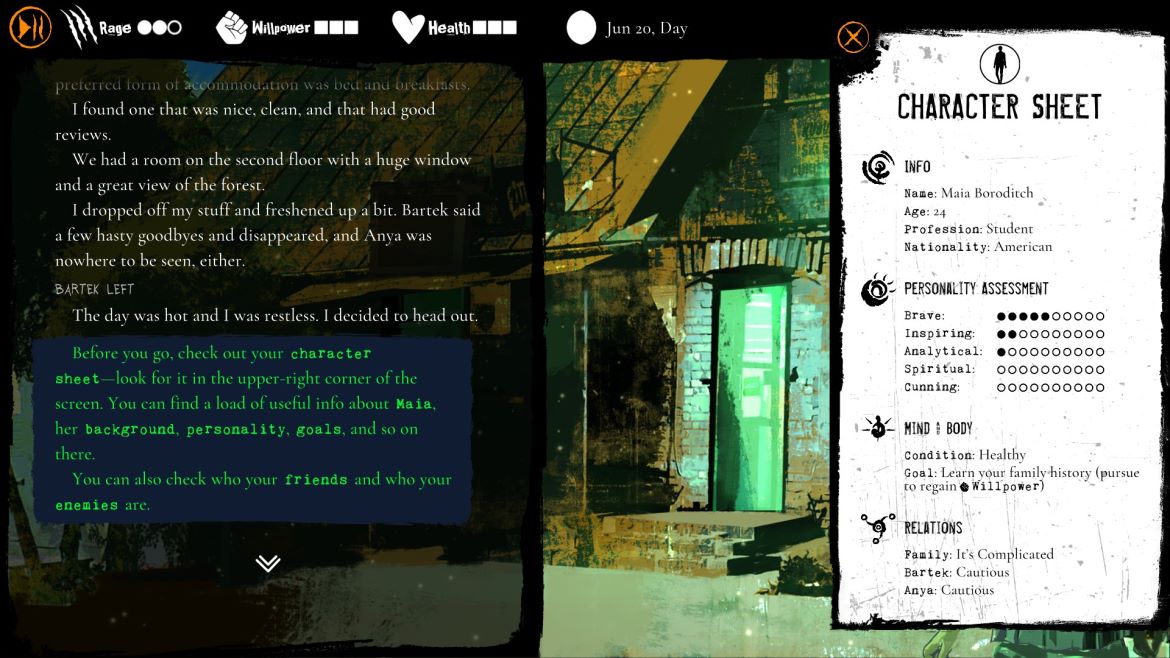 Det finns även en informationsruta som vi har tillgång till. Här finns information om Maria, hur hon mår, hennes relation till de som hon har träffat på och hennes personlighetsdrag. Det finns sex stycken olika personlighetsdrag och de är Brave, Inspiring, Analytical, Spirutal och Cunning. Dessa kommer att påverkas beroende på de val du gör i dialogerna och beroende på vilken som du har mest poäng i så kan du få nya dialogval baserade på dem.