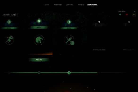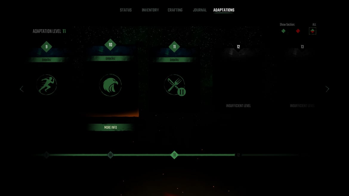 Att överleva i vildmarken är inte för de veka, du behöver skapa dina egna förutsättningar. Som hjälp har du Adaption vilket är detta spels leveling-system, namnet är tämligen välvalt med tanke på var du befinner dig men det är det enda valet jag gillar – då du inte får välja något i det själv. Du får erfarenhet av en mängd olika saker, skapa utrustning, plocka resurser och döda djur är några. När du levlar upp får du en användbar perk som ger dig bättre förutsättningar, det kan till exempel vara att djur har svårare att upptäcka dig, att du klarar dig längre utan vatten eller kan springa längre utan att bli trött.