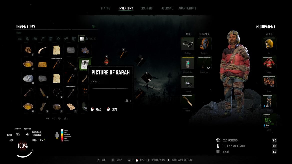 Ryggsäcken fungerar via ett viktsystem, alla föremål har ett viktvärde som läggs ihop och avgör hur mycket som kan bäras. Detta kan vara en stor sten som väger ett pund, en gren som väger ett halvt, ett foto av din gravida fru som väger ett helt pund eller en nyckel som också väger det. Vikterna känns inte realistiska och att vissa föremål som är viktiga (nyckeln och fotot) och inte kan slängas bör inte väga något alls i min mening. Det går att sortera fram föremål i din ryggsäck via olika filter men någon egen ordning går inte att ordna, allt är en massiv röra. Det går inte att permanent göra sig av med föremål vilket gjorde att jag vandrade genom en massiv hög av ruttna morötter varje gång jag lämnade stugan. Metaforen känns nästan för perfekt.