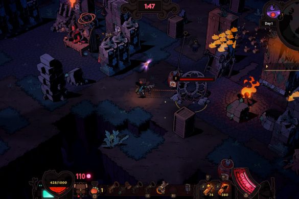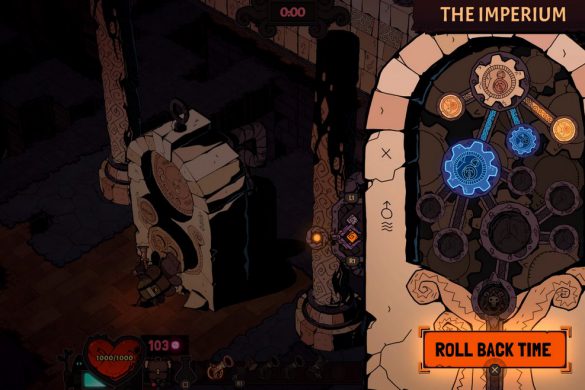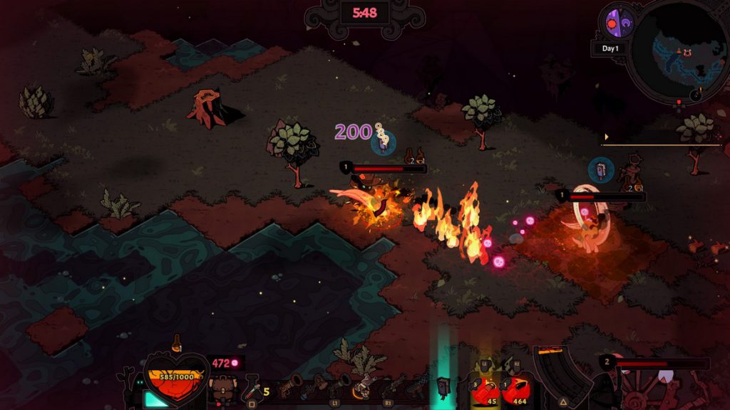 Vi har att göra med ett Roguelike Action spel med isometrisk vy och ett utseende som påminner om Don’t Starve, fast med mer traditionellt animerade karaktärer istället för pappfigursutseendet. Den tidigare nämnda mörkare och mer mystiska världen fungerar som en slags hubvärld. Här uppgraderar vi utrustning och startar fem minuters loopen. När vi ränner omkring i den “vanliga” världen, har vi som mål att besegra några speciella karaktärer för att sno åt oss de kugghjul som de har i sin ägo. Kugghjulen stoppar vi in i maskinen som spolar tillbaka tiden, för att få tillgång till fler områden i världen. Vi måste även samla på oss otroligt många resurser av olika slag. Utrustningen måste ju skapas av någonting. Skulle du dö kommer du skickas tillbaka till hubvärlden och alla resurser kommer förloras, men du får behålla dina vapen och dess ammunition. Jag gillar detta då uppförsbacken som det brukar innebära att behöva börja om från början igen inte är lika brant.